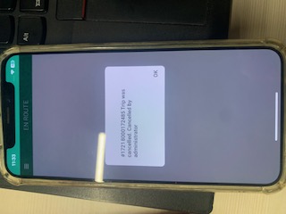 Rider App IoS device: User is able to view the alert such as "Trip was cancelled. Cancelled by administrator"