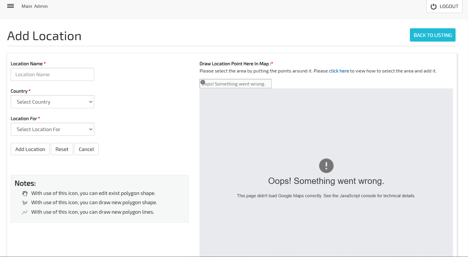 Not able to add the location in the staging server. The map is not showing the add location page, and the message "Something went wrong" is showing instead.